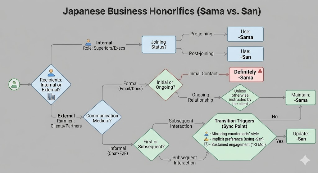 External (Clients / New Partners)-SamaThe High Wall: Maintains formal distance and shows maximum respect to “Soto” (outsiders).High: Using -San can be perceived as rude or lack of etiquette.